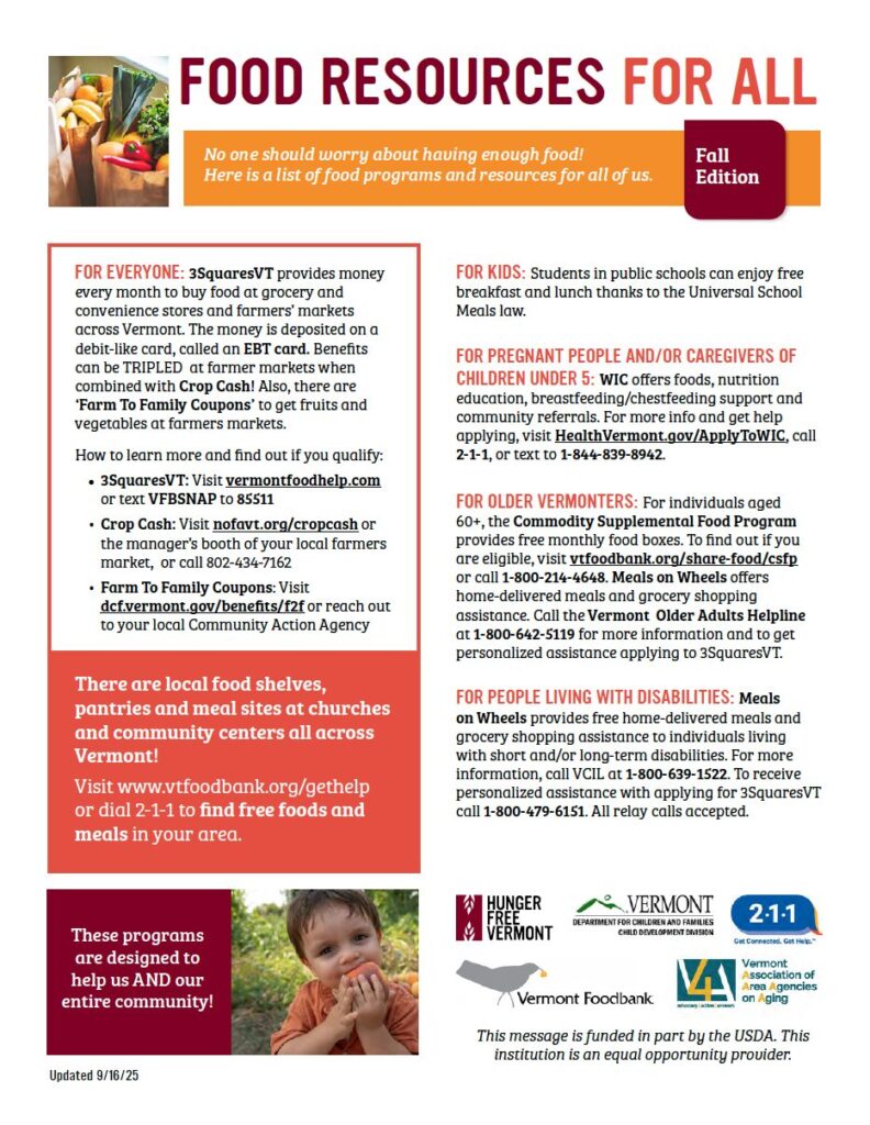 Information on 3SquaresVT, Food for children, Food for older Vermonters, People with Disabilities, and other Food Resources is available on their website. Click here.